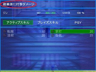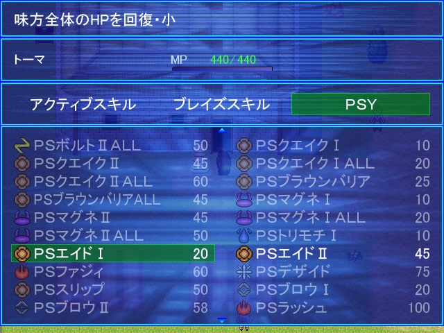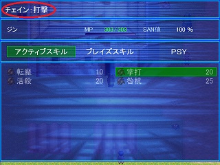 各キャラの所有しているスキルやPSYを使用・確認する事ができます。