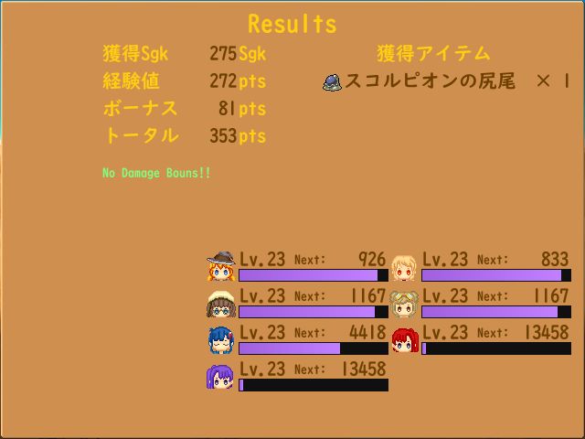 リザルトでは経験値と獲得sgk(お金)敵が落としたアイテムが表示されます。