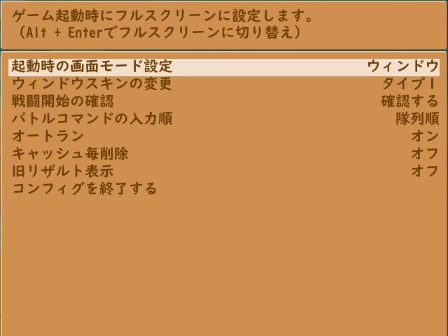 コンフィグ 起動時の画面モード設定 ゲーム起動時にフルスクリーンに設定します。 ウィンドウスキンの変更 ウィンドウのスキンを変更します。 戦闘開始の確認 戦闘を開始する前にアクションを確認します。 バトルコマンドの入力順 コマンドの入力順を隊列・素早さのどちらかに設定します。 オートラン 通常の移動でダッシュ状態にするかを設定します。 キャッシュ毎削除 シーン毎にキャッシュを削除します。 旧リザルト表示 リザルト表示をツクールデフォルトにします。 コンフィグの終了する コンフィグメニューを終了します。