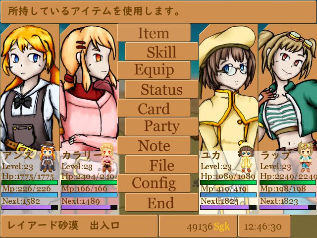 所持しているアイテムを使用・確認します。 Skill キャラクターが習得しているスキルを使用・確認・セット・習得します。 キャラクターに所持している武器・防具・装飾品を装備します。 キャラクターのステータスを確認します。 Card キャラクターにクラフトカードをセットします。 Party 戦闘に参加するキャラクターを選びます。 Note 現在の目的やあらすじ、受領したクエスト等を確認します。 File セーブ・ロードを行います。 Config 各種設定を行います。 End タイトルリセット・ゲームを終了します。