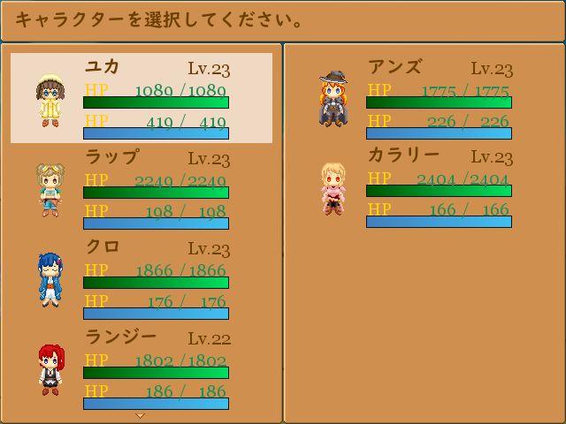 パーティ 戦闘に参加するパーティを設定します。 最大4人まで選択が可能で、戦闘中でも変更が可能です。 戦闘に参加してないキャラクターはターン・戦闘終了時にHP/MPが少量だけ回復し、ココロステートも解除されます。 (戦闘不能・カラダステートは回復されません。) また、戦闘に参加してないキャラクターは、ターン終了時にBPが減少します。 <戻る>